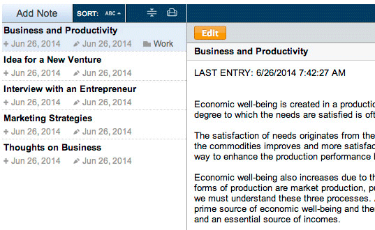 Record your thoughts, notes and ideas for reference.Keep track of your ideas with Toodledo's Notes section. Write down your memories, use it as a journal, log recipes, trip notes or anything you like. You can edit your text with HTML and sort your notes into folders to reference in the future.