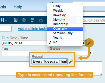 Automatically repeat tasks on a schedule of your choosing. You can quickly choose a commonly used schedule (Daily, Weekly, etc) or customize it using our advanced options such as "Every Tue, Thur" or "The 1st Friday of each month".