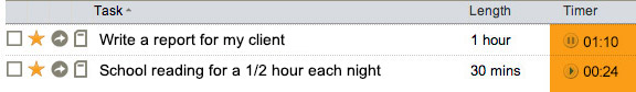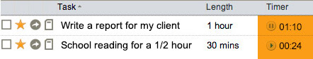 The timer can be used to track the actual time spent on a project. This is useful for billing clients, filling out time cards or for your own information. If you compare this to the length column (which keeps track of estimated time), you will become better at estimating time. You can have several timers running at once, and timers will continue to run even if you turn off your computer.