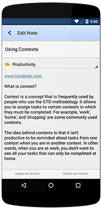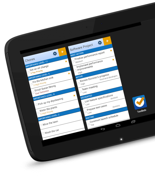 Access the entire Toodledo Productivity System on your Android phone or tablet. Our native Android app automatically syncs to ensures that your stuff is ready anywhere that you need it.